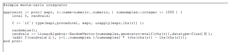 This procedure efficiently calculates a one-variable integral using the above formula where r is a random input to f.