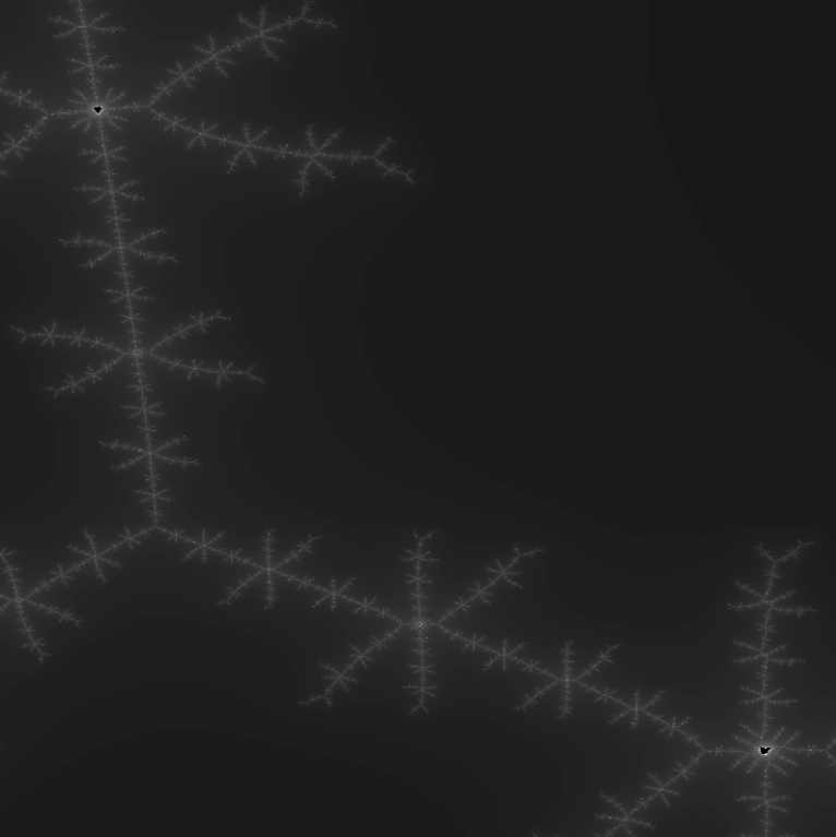 The Mandelbrot command generates Array images which provide a visualization of the Mandelbrot set. The entries of the image are shaded according to the behavior of complex input points under a particular iterative rational map. Taking an initial point z[0]=0+0*I then for each complex input point c a sequence of points z[i] are computed until abs(z[i]) exceeds the cutoff value (ie. escapes).